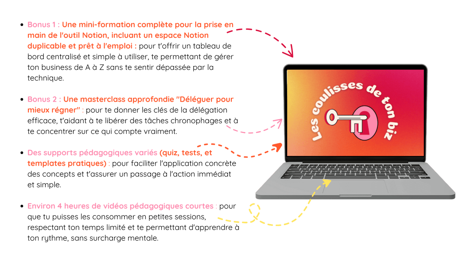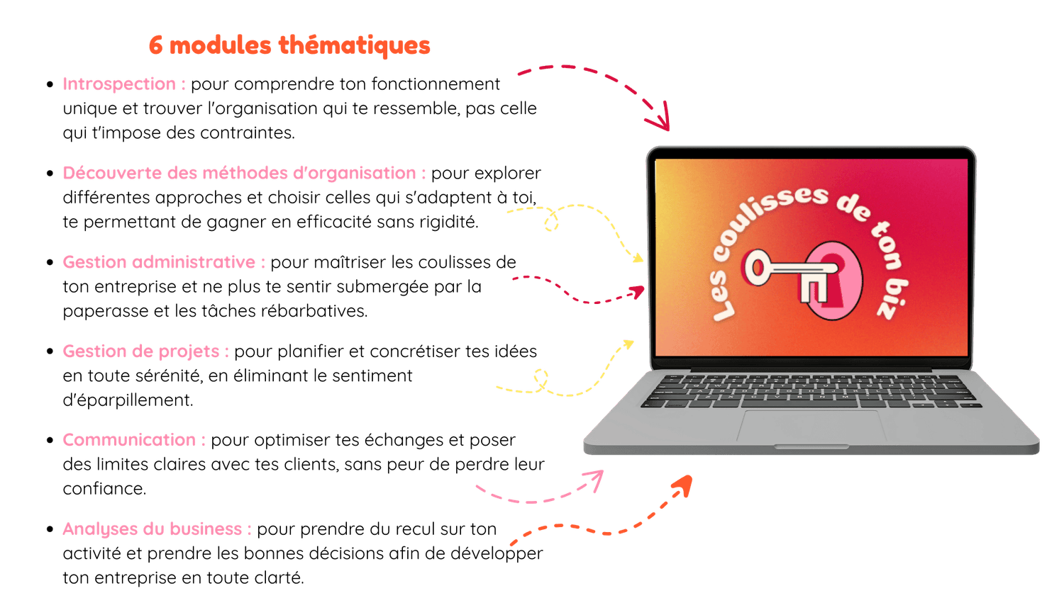 C'est pourquoi, en 2023, j'ai créé "Les coulisses de ton biz", une formation pensée pour t'aider à structurer ton activité et retrouver la sérénité.